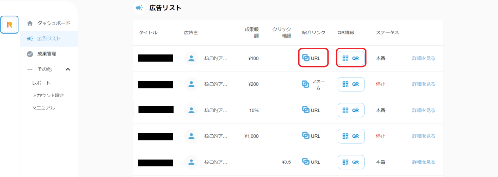 ステータスが「停止」と表示されている広告は、成果が達成されても報酬は発生しませんのでご注意ください。